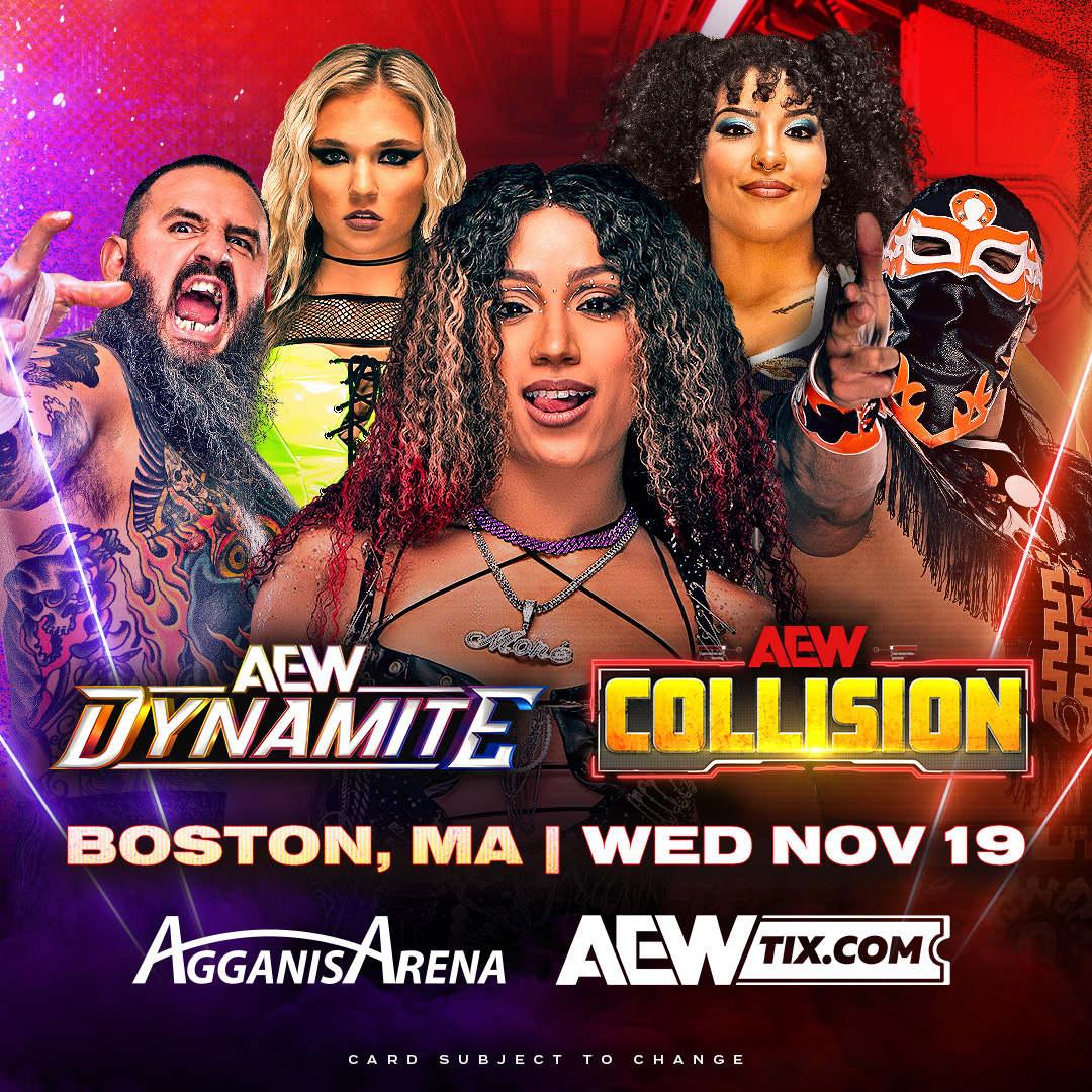 BOSTON! All Elite Wrestling returns with an epic, double-down night of professional wrestling as AEW Dynamite AND AEW Collision invade Agganis Arena on November 19th! See the best wrestle for the best price and get your tickets now.